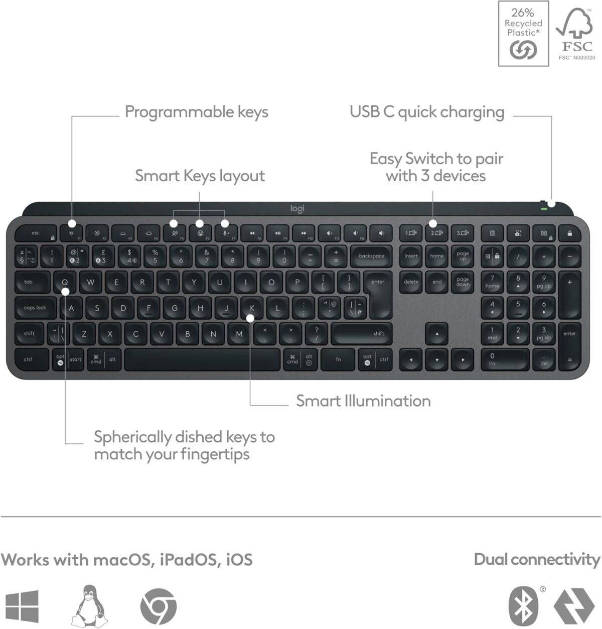 - Recycled: Plastic parts in MX Keys S Wireless Keyboard include certified post-consumer recycled plastic — 26% for Graphite and 11% for Pale Grey (5)